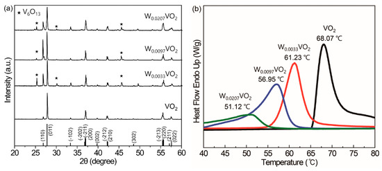 (a) XRD patterns and (b) DSC thermograms of tungsten-doped vanadium oxides obtained with different tungsten doping concentrations.