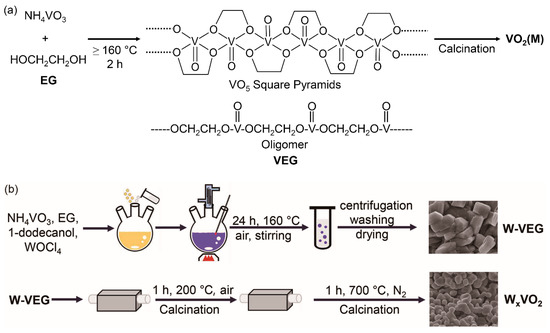 (a) Reaction for the preparation of VO2 (M) via a polyol method and (b) a schematic illustration of the W-VEG synthesis and calcination.