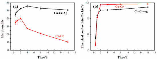 Figure 1 shows the hardness and conductivity of the Cu–Cr and Cu–Cr–Ag alloys at 450 °C. As shown in Figure 1a, compared with Cu–Cr, the Cu–Cr–Ag alloy showed higher hardness at the same aging time. The hardness of the two alloys increased rapidly and then decreased after reaching the peak value. The peak hardness of Cu–Cr reached 120.3 Hv after aging for 2 h, while that of the Cu–Cr–Ag alloy reached 135.8 Hv after aging for 4 h, and the decreasing trend was slower. When aging time was 16 h, the hardness of the Cu–Cr alloy was only 90 Hv, which was 30 Hv less than that at the peak aging state, and the hardness of the Cu–Cr–Ag alloy was 130 Hv, which was only 5 Hv less than that of the peak aging condition. The result illustrated that the hardness and stability of the mechanical properties of the Cu–Cr alloy improved with Ag elements. The conductivity of both alloys rapidly increased and gradually stabilized, as shown in Figure 1b. Compared with cold-rolled alloys, the conductivity of the Cu–Cr and Cu–Cr–Ag alloys aged for 2 h increased by 13.1% and 9.8% IACS, respectively. Electrical conductivity corresponding to the peak hardness of the Cu–Cr and Cu–Cr–Ag alloys was 99.5% and 98.3% IACS, respectively.