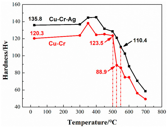 Figure 2 presents the change in hardness of the alloys after 1 h incubation at different annealing temperatures. The hardness of the two alloys slightly increased and then decreased with the rise of temperature. According to GB/T 33370-2016, the softening temperature of copper and copper alloys is defined as the temperature corresponding to hardness dropping to 80% of the original hardness. The hardness of the Cu–Cr binary alloy that annealed at 500 °C was 123.5 HV, which rapidly decreased to 88.9 Hv at 550 °C, namely, 74% of the peak-aging hardness. This indicated that the softening temperature of the Cu–Cr alloy was 500~525 °C. The hardness of the Cu–Cr–Ag alloy at 550 °C was 110.4 HV, which is about 80% of the peak-aging hardness. Therefore, softening temperature was about 550 °C, which was higher than that of the Cu–Cr alloy.