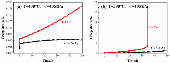 The creep curves of both alloys at 400 and 500 °C are shown in Figure 3. Under the same loading stress, the creep curves of the two alloys showed the same trend, namely, strain positively rose with loading time. Strain also rose with an increase in temperature. The creep strain of the Cu–0.2Cr alloy was 0.18% after loading at 400 °C for 50 h, and that of the Cu–0.2Cr–0.12Ag alloy was 0.05%. However, the creep strain of the Cu–Cr alloy obviously changed as temperature rose to 500 °C. When loading time was increased to 35 h, a creep fracture occurred in the Cu–Cr alloy, but the creep stress of the Cu–Cr–Ag alloy was only 1.3% after 50 h. Data illustrated that the Ag element improved the thermal stability of the Cu–0.2Cr alloy, which was consistent with the results in Figure 2.