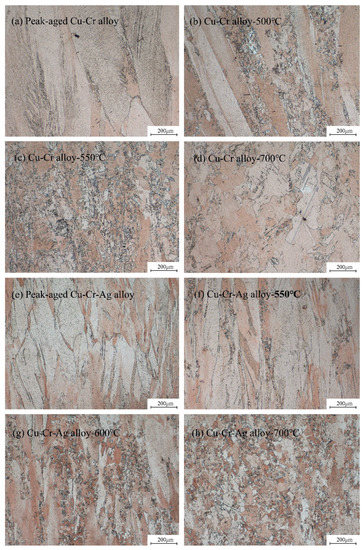 Figure 5 shows the microstructure of alloys after annealing at different temperature levels for 1 h. As shown in Figure 5a,e, the fiber structures existed after large plastic drawing deformation of the alloys. Recrystallization occurred in the Cu–Cr alloy at 500 °C, as shown in Figure 5b, which was accelerated with rising annealing temperature, and the fiber structure eventually transformed into a recrystallized equiaxed structure, as shown in Figure 5d. The microstructure evolution of the Cu–Cr–Ag alloy during annealing was similar to that of the Cu–Cr alloy, but Ag elements obviously inhibited the recrystallization of the alloy, which corresponded to the results in Figure 2.