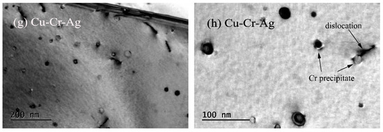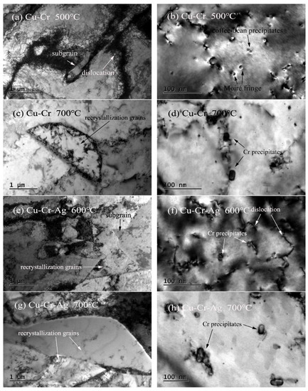 The TEM microstructures of both alloys at different annealing temperature levels for 1 h are shown in Figure 6. Subgrains, and fine and dispersed Cr precipitates were found in the Cu–0.2Cr alloy at 500 °C, as shown in Figure 6a,b, and the size of the precipitated phase was consistent with that in the peak aging state. As temperature rose to 700 °C, dislocation density decreased, obvious recrystallized grains existed in the Cu–Cr matrix, and precipitates coarsened, as shown in Figure 6c,d. Recrystallization of the Cu–Cr–Ag alloy occurred at 600 °C. The size of Cr precipitates did not significantly increase, but recrystallized grains grew, and precipitates obviously coarsened at 700 °C. Therefore, the softening of the Cu–Cr and Cu–Cr–Ag alloys was accompanied by the recovery, recrystallization, grain growth, and coarsening of precipitates.