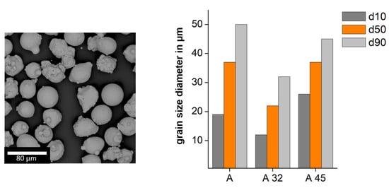Figure 2 depicts the morphology of the powder and the particle size distribution of the different powder batches A32 and A45. In the powder samples, a spherical characteristic with minor satellites is observed which are free of porosity. The particle size distribution of the powder was analyzed by a Camsizer X2 based on dynamic digital image analysis methods according to ISO 13322-2 (Retsch Technology GmbH). This particle size distribution and morphology allows good flowability and packing density, as was demonstrated in a flowability test conducted using the Hall flowmeter funnel.