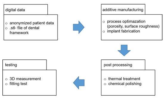 The flow chart of the experimental tasks carried out in this report is shown in Figure 4. Beside the metallurgical and physical examination of powders and test specimen, the generation of the dental framework is conducted as follows. Beginning from digital data, obtained by anonymized patient data and prepared in .stl-data format, we have additively built both specimen for testing and the dental bar by SLM (implant fabrication). Here we focus particularly on the surface roughness by optimizing the particle size distribution of the metal powder. After post processing by thermal treatment and polishing, the dental framework is characterized with particular focus on 3D form deviation and fitting accuracy.