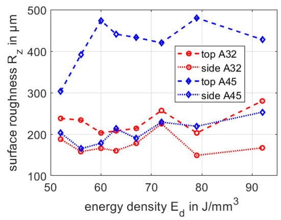 The surface roughness of SLM parts, in general, depends on the grain size distribution of processed powder and used process parameters [48,49,50]. Furthermore, the surface roughness appears different on top and side surfaces, with respect to the build direction. In Figure 6 the surface roughness is shown for the top and side surfaces for the powder A32 and powder A45 as function of the applied energy density. A suitable process window regarding the porosity is already defined by the porosity between the energy density of and .