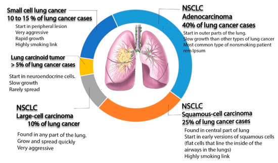 Adenocarcinoma is a popular type, representing around 40% of all total diagnostic cases. It usually occurs in smokers and nonsmokers [6]. It arises from small airway epithelial cells that form the lining of the lung and alveolar cells: the mucus secreting cells [7]. Furthermore, it grows slowly and can spread outside the lungs. Adenocarcinoma is characterized histologically by the presence of glandular/acinar growth, papillar differentiation, or a single-layer of wallpaper-like spread along the alveolar septum and bronchioles [8]. Squamous-cell carcinoma is derived from the squamous cell type located at the airways of the epithelial cells. These cells line the bronchial tubes in the center of the lungs. This type is mostly associated with smoking tobacco, and it represents 30% of all lung cancer patients [9]. It is histologically identified by the presence of keratinization or intercellular bridges.