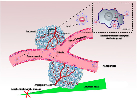 EPR can increase the distribution of encapsulated cargo molecules, whereas nano-sized particles show good accumulation in tumor tissues because they can rapidly reach a specific location with a higher concentration than other formulations [32]. Meanwhile, active targeting can be developed through the conjugation of drugs to specific ligands that have good affinity to bind receptors that are overexpressed by tumor tissues. Hence, drugs act as prodrugs until they are recognized by the active sites of tumor cells [33] (see Figure 2).