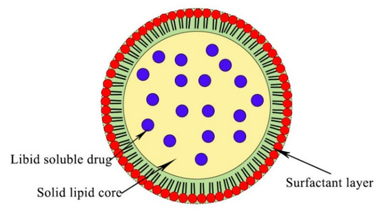 Structure of a solid lipid nanoparticle (SLNP) with lipophilic drugs inserted into its core. The drug molecule distribution in the lipid droplet depends on the use of appropriate techniques and the melting point for the solid lipid.