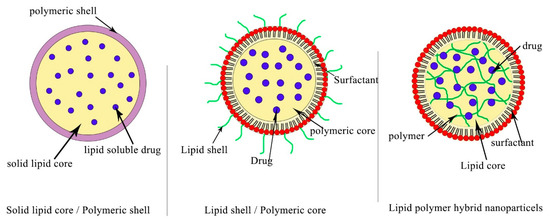 Recently, advanced nanotechnology has undergone significant progression by using materials for the production and design of an optimal drug delivery system, since the physicochemical properties of polymers are used as an advantage to develop both liposomes and solid lipid NPs and to overcome their drawbacks during fabrication. These new structures are called polymeric hybrid lipid nanoparticles. Polymeric hybrid lipid nanoparticles contain three main structures, as follows: (1) a hydrophobic/hydrophilic polymeric core inserted inside liposomes or coated by a lipid monolayer; (2) a solid lipid core or liposomal phospholipid/cholesterol layer surrounded by a polymeric shell; (3) polymer materials incorporated inside solid lipid or liposomal phospholipid/cholesterol layers and then and an outer component consisting of a PEGylation.