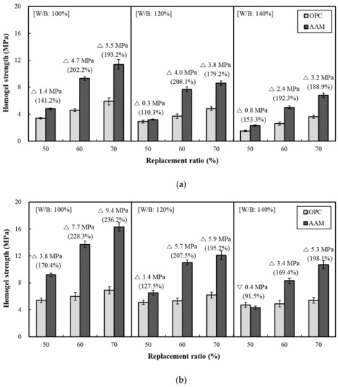 - In both OPC and AAC specimens, the homogel strength tended to increase as W/B decreased and the replacement ratio increased. At 7 days of age, W/B ratios of 100%, 120%, and 140%, and a replacement ratio of 70%, the AAC specimens exhibited higher homogel strength by 9.4 MPa (236.2%), 5.9 MPa (195.2%), and 5.3 MPa (198.1%), respectively. Hence, under the same mixing conditions, AAC is more advantageous for securing homogel strength than OPC.