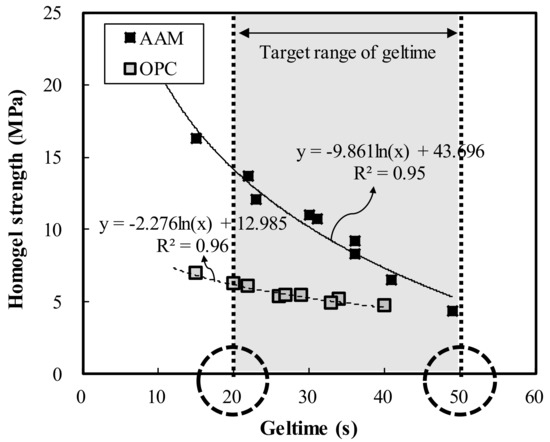 - At 3 days of age, OPC showed an increase of 1.7 MPa when the binder weight increased by 100 kg/m3, whereas AAC showed an increase of 4.1 MPa. In addition, at 7 days of age, OPC showed an increase of 0.9 MPa when the binder weight increased by 100 kg/m3, whereas AAC showed an increase of 5.0 MPa. Geltime and homogel strength were found to be inversely related for both OPC and AAC.
