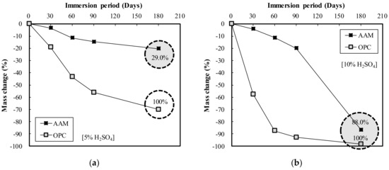 Meanwhile, Figure 11 displays the mass change according to the immersion period of the OPC and AAC specimens in H2SO4 solution. In Figure 11a, the results of immersion in 5% H2SO4 solution indicate that mass change decreased rapidly for OPC and gradually for AAC. After 180 days of immersion, the mass change of AAC was low at 29.0% of that for OPC. Conversely, in 10% H2SO4 solution as shown in Figure 11b, the mass change of AAC was somewhat lower at 88.0% of that for OPC. The mass change of AAC gradually decreased until 90 days of immersion, after which it rapidly decreased; in contrast, for OPC, mass change rapidly decreased in 60 days of immersion and then gradually decreased.