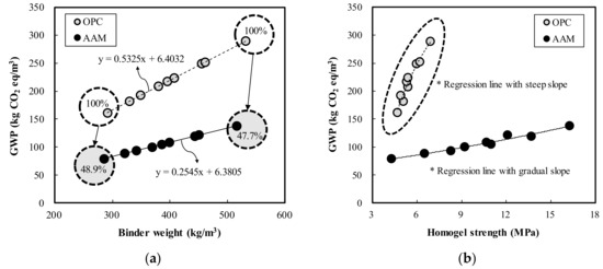 Figure 12 shows a comparative analysis of GWP of the OPC and AAC specimens. According to the analysis of change in GWP relative to binder weight in Figure 12a, GWP tended to increase as the binder weight increased. For OPC, GWP increased by 25.45 kg CO2 eq with a 100 kg/m3 increase in binder weight, while GWP of AAC increased by 53.25 kg CO2 eq. Thus, under the same mixing conditions, the GWP of AAC was low at 47.7 to 48.9% of OPC. Figure 12b illustrates the change in GWP according to the homogel strength; both OPC and AAC exhibited an increase in GWP as the homogel strength increased. In particular, for OPC, the relationship between homogel strength and GWP presented a steeper slope than that of AAC. This demonstrates that AAC has a greater effect on CO2 reduction than OPC.