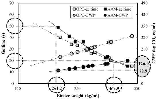 Figure 13 shows the binder weight range and GWP of OPC and AAC that satisfy the target geltime range (20–50 s). For reference, all specimens satisfying the target geltime range exceeded the target homogel strength of 2 MPa. According to the analysis, the OPC and AAC binder weight ranges satisfying the target geltime range were estimated at 180.1–471.1 kg/m3 and 261.2–469.9 kg/m3, respectively. Moreover, GWP in relation to binder, weight range was 102.3–257.3 kg of CO2 eq/m3 and 72.9–126.0 kg of CO2 eq/m3. Therefore, by applying AAC to actual sites under conditions that satisfy the target geltime range, the GWP was expected to be 29.5 (28.8%)–131.3 (51.0%) kg CO2 eq/m3 less than that of OPC.