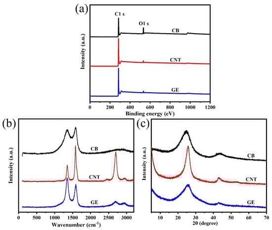 (a) XPS survey spectra; (b) Raman spectra, and (c) XRD patterns of CB, CNTs, and GE.