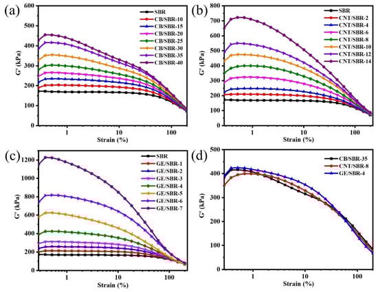 Storage modulus versus dynamic strain of SBR compounds filled with different contents of (a) CB; (b) CNTs and (c) GE; (d) storage modulus versus dynamic strain of CB/SBR-35, CNTs/SBR-8, and GE/SBR-4 compounds.
