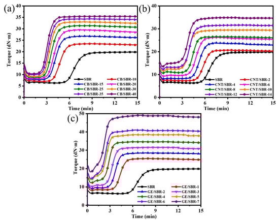 Curing characteristics of SBR compounds filled with different contents of (a) CB; (b) CNTs and (c) GE.