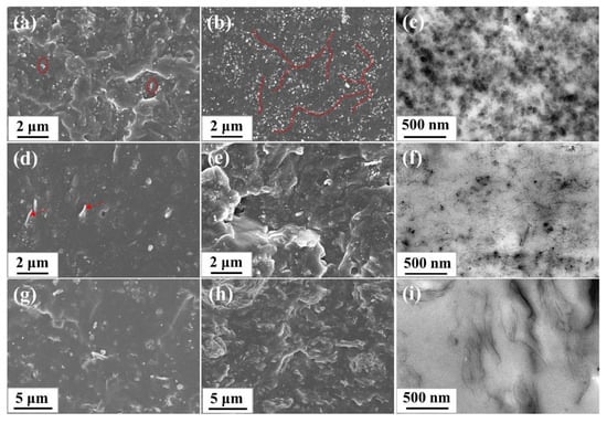 SEM images of different SBR composites: (a) CB/SBR-10; (b) CB/SBR-35; (d) CNTs/SBR-2; (e) CNTs/SBR-14; (g) GE/SBR-1; (h) GE/SBR-7. TEM images of (c) CB/SBR-35; (f) CNTs/SBR-8, and (i) GE/SBR-4 composites.