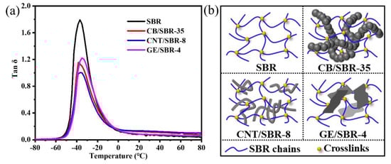 (a) Loss factor (tan δ) versus temperature of and (b) schematic diagram of the filler networks of SBR, CB/SBR-35, CNTs/SBR-8, and GE/SBR-4 composites.