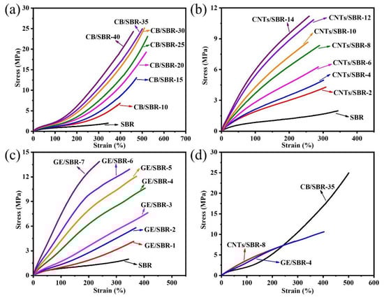 Strain-stress curves of SBR composites filled with different contents of (a) CB; (b) CNTs and (c) GE; (d) strain-stress curves of CB/SBR-35, CNTs/SBR-8 and GE/SBR-4 composites.