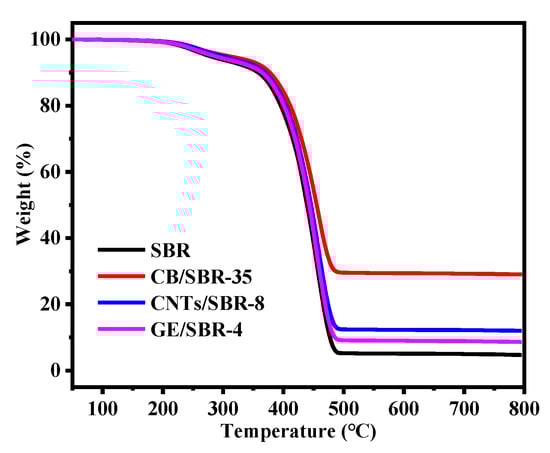 The stress-strain curves of SBR composites reinforced by different contents of CB, CNTs, and GE were shown in Figure 7a–c. The results showed that the modulus at 100% strain increased with the increase in the nanofiller contents. The increase was attributed to the enhanced filler networks which were conducive to transferring the stress from SBR macromolecules to filler networks. Figure 7d shows the strain-stress curves of the different SBR composites with the same strength of filler networks, and the mechanical properties were displayed in Table 1. CNTs/SBR-8 and GE/SBR-4 composites exhibited similar tensile behaviors, which were significantly different from that of CB/SBR-35 composite. This was caused by the different structure of filler networks formed by the three types of topological fillers. Among the three composites, CNTs/SBR-8 composite possessed the highest modulus at 100% strain and the smallest elongation at break, reflecting that CNTs had the strongest restriction effect on SBR macromolecules. As for CB/SBR-35 and GE/SBR-4 composites, although the filler network formed by 35 phr CB had a stronger restriction on SBR macromolecules than the filler network formed by 4 phr GE, the continuous CB chains were easily broken, and SBR macromolecules would slip on the surface of CB during the stretching process. Thus, CB/SBR-35 composite possessed higher elongation at break and modulus at 300% strain than GE/SBR-4 composite, while GE/SBR-4 composite possessed higher modulus at 100% strain than CB/SBR-35 composite. Moreover, the tear strength of CB/SBR-35 was much higher than CNTs/SBR-8 and GE/SBR-4. This was attributed to the dissipation of energy during stretching caused by the continuous slippage of SBR macromolecules on the surface of CB. It is also noticeable that the hardness of GE/SBR-4 was much higher than CB/SBR-35 and CNTs/SBR-8. This is because the large GE sheets could adsorb more SBR macromolecules and form physical crosslinking points, thereby making GE/SBR-4 possess higher hardness. In addition, the TGA curves of pure SBR, CB/SBR-35, CNTs/SBR-8 and GE/SBR-4 composites were displayed in Figure 8. After analyzing the curves in Figure 8, it is found that the thermal stability of the obtained composites was mainly related to the contents of fillers. The more filler contents, the better the thermal stability of the composite.