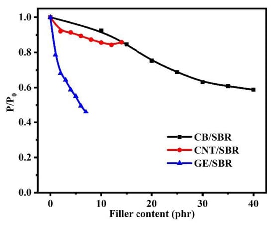 The gas barrier properties of rubber composites were strongly dependent on the filler networks in rubber composites. The relative permeability coefficients (p/p0), which are the ratio of the permeability of SBR composite to the permeability of pure SBR, were shown in Figure 9. The results show that the gas barrier properties of the SBR composites were all improved to a certain extent after the addition of nanofillers. However, the composites reinforced by different topology of nanofillers showed different trend in improvement of gas barrier properties. For CB/SBR composites, when CB content was lower than 30 phr, the relative permeability coefficients of the composites gradually decreased as the CB content increased. When CB content exceeded 30 phr, the relative permeability coefficients of the composites tended to be stable. For CNTs/SBR composites, when CNTs content was lower than 12 phr, the relative permeability coefficients of the composites gradually decreased as the CNTs content increased. When CNTs content reached 14 phr, the relative permeability coefficient of the composites increased instead, which was caused by the severe aggregation of CNTs. It is noted that the composites filled with 2 phr CNTs and 10 phr CB possessed almost equal relative permeability coefficient, demonstrating that one-dimensional CNTs with high aspect ratio had more advantage than spherical CB in improving the gas barrier properties rubber composites at low filler content. For GE/SBR composites, the relative permeability coefficients gradually decreased with the increase in GE content. The relative permeability coefficient of SBR composites filled with 1 phr GE was lower than those of SBR composites filled with 12 phr CNTs or 15 phr CB, revealing the superiority of GE than CNTs and CB in improving the barrier properties of rubber composites.
