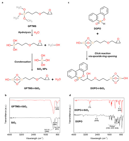 (a) Synthesis mechanism and (b) Fourier transform infrared (FTIR) spectra of GPTMS-t-SiO2. (c) synthesis mechanism and (d) FT-IR spectra of DOPO-t-SiO2.