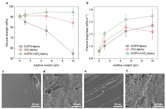 (a) Flexural strength and (b) fracture toughness of DOPO/epoxy, SiO2/epoxy and DOPO-t-SiO2/epoxy nanocomposites with the content of additives, respectively. SEM images of (c) pristine epoxy, (d) DOPO/epoxy, (e) SiO2/epoxy and (f) DOPO-t-SiO2/epoxy nanocomposites, respectively.