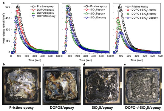 (a) Heat release rate measured using cone calorimeter of pristine epoxy, DOPO/epoxy, SiO2/epoxy and DOPO-t-SiO2/epoxy nanocomposites with the content of additives, respectively. Photographs of (b) pristine epoxy, (c) DOPO5/epoxy, (d) SiO25/epoxy and (e) DOPO-t-SiO25/epoxy nanocomposites after cone calorimeter test, respectively.