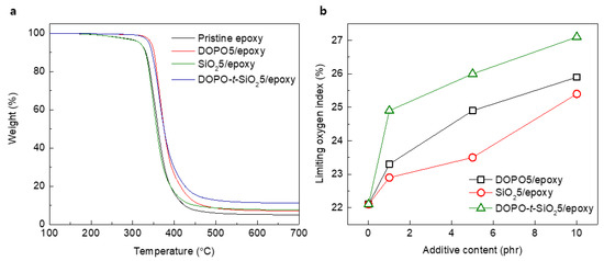 (a) Thermogravimetric analysis (TGA) traces of pristine epoxy, DOPO5/epoxy, SiO25/epoxy and DOPO-t-SiO25/epoxy nanocomposites, respectively. (b) Limiting oxygen index plots of DOPO5/epoxy, SiO25/epoxy and DOPO-t-SiO25/epoxy nanocomposites, respectively.