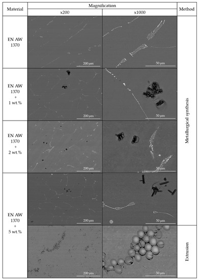 Microstructural and energy-dispersive X-ray analysis, which made it possible to determine the presence of the reinforcement and the identification of the chemical composition of the given area was conducted using scanning electron microscope Hitachi SU-70 (Hitachi Ltd., Tokyo, Japan) on previously prepared metallographic specimens taken from the central part of the ingot (concerning samples obtained by the metallurgical synthesis) and at the cross-section of the extruded composite.