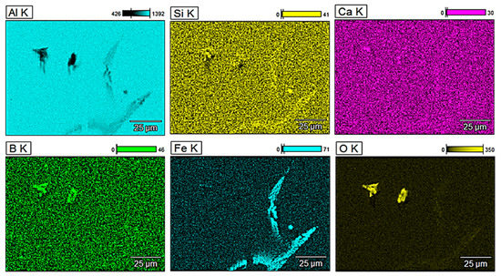 Iron precipitations as well as boron and silicon oxides were also visible in terms of the composite material with 2 wt.% of GF. Since the base material is aluminium EN AW 1370, it consists of roughly 99.7 wt.% of Al, 0.2 wt.% of Fe and 0.1 wt.% of Si, which explains the primary precipitates of Al-Fe (Si). These are visible at Fe mappings of all the tested samples obtained by metallurgical synthesis and are not visible concerning sample obtained in the extrusion process (Figure 7).