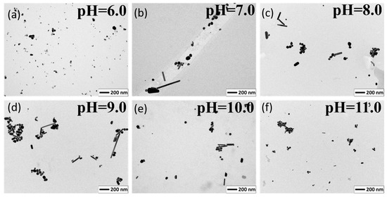 TEM images of the silver nanoparticles reduced by citric acid at pH 6.0 to 11.0. (a) pH = 6.0; (b) pH = 7.0; (c) pH = 8.0; (d) pH = 9.0; (e) pH = 10.0; (f) pH = 11.0.