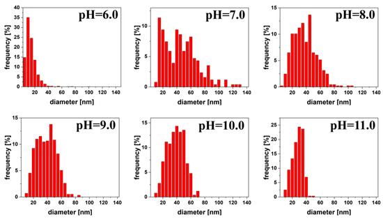On the basis of a minimum of 200 measurements, size distributions were plotted. At pH 6.0, we observe a very narrow distribution of the size obtained nanoparticles, while at pH 7.0 it was very wide. From pH 7.0 to 11.0 we clearly see that the size distributions were getting narrower, and thus the polydispersity of the colloid decreased. Size distributions for the nanoparticles are shown in Figure 3. The same scale in nm on the x-axis was used for all size distributions for greater transparency.