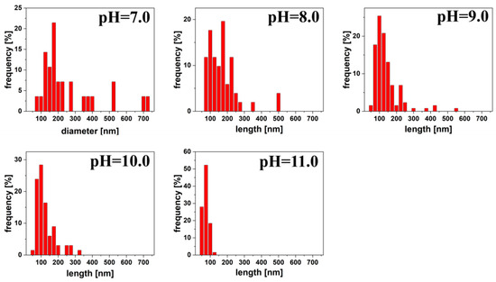 In addition to the spherical shapes, in the TEM images, we can also see other shapes, mainly rods. They occurred from pH 7.0 to 11.0 and represented 9.89%, 10.26%, 18.49%, 20.32%, and 19.48% for pH 7.0, 8.0, 9.0, 10.0, and 11.0, respectively of all measured nanoparticles. As we can see in Figure 4. the distribution of rod length was gradually narrowed and size decreased as pH increased. The average size was 234.65 ± 172.98, 157.00 ± 88.26, 123.84 ± 75.10, 110.00 ± 56.63, 61.51 ± 15.40 nm for pH 7.0, 8.0, 9.0, 10.0 and 11.0 respectively.