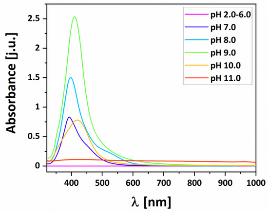 Stability of the colloids reduced by citric acid can be explained by the fact that citrate ions act also as stabilizers in the reduction reaction—stabilized nanoparticles by charge repulsion and are weakly bound to the silver producing a charged layer that serves as an electrostatic barrier to aggregation [7,34]. At pH 6.0, there is a slight increase in absorbance that could not be the result of the fluctuations associated with dilution. This is due to the fact that the solution contains unreduced silver ions and at room temperature citric acid is capable of reducing Ag+ ions, but it is a very slow process. That is why we can observe the increase of the absorbance at pH 6.0 after a few weeks [35]. From pH 7.0 to 11.0, there is a practically constant value of absorbance and only a small, up to several nanometers, fluctuation in λmax at longer wavelengths, which is evidence of stability. Therefore, they do not contain unreduced silver ions, because there is no increase of the absorbance.