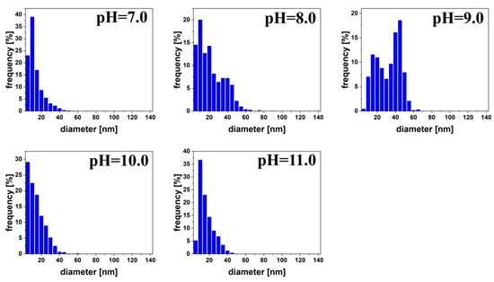 Size distributions of the nanoparticles are shown on Figure 8. For pH 7.0, 8.0, 10.0, and 11.0, the size distribution had a very similar shape and was shifted towards smaller values. However, at pH 9.0 we observed two maxima, the first at about 15 nm, and the second at 42.5 nm. The same scale in nm on the x-axis was used for all size distributions for greater transparency.
