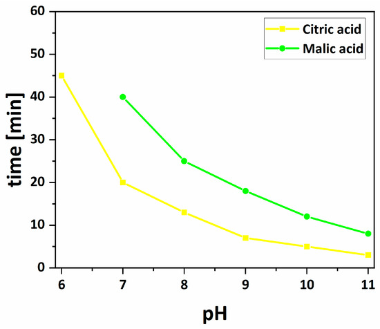 The dependence of time after which the reaction was observed as a function of pH for silver nanoparticles reduced by citric and malic acids.