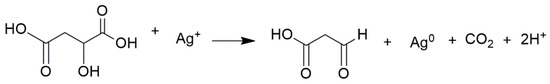 The reaction for citric acid occurred from pH 6.0 to 11.0, while for malic acid it occurred from pH 7.0 to 11.0. Both acids in the reaction served as a reducing agent and stabilizer [24,26]. In the reaction, the citric acid was oxidized to acetone dicarboxylic acid (Scheme 1) [24], whereas malic acid was oxidized to 3-oxopropanoic acid (Scheme 2).