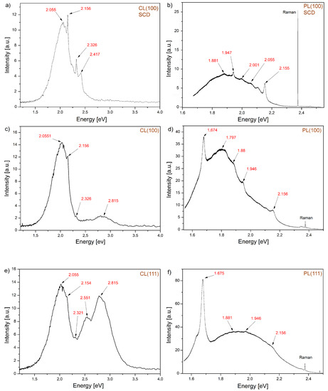 For analyzing the obtained results, it is convenient to divide them into two spectral areas, i.e., the 1.6–2.4 eV spectral region where color centers are visible both in the PL (2.54 eV due to excitation energy) and the CL spectra and in the 2.4–4.0 eV spectral region where color centers are recorded only in the CL spectroscopy. A strong peak in the PL spectra for microcrystallites is observed related to the GR1 defect centered at 1.675 eV. It is thought to consist of a vacancy in a neutral (V) state [21]. The nitrogen vacancy related defects are among the essential ones in diamonds due to potential photonics applications. They can exist in two configurations [24]: nitrogen-neutral vacancy (NV) observed at 2.156 eV in CL and PL spectra, and negatively charged nitrogen vacancy (NV) at 1.945 eV. The last one is of the most important centers in diamond (possible Qubit). It may be observed in photoluminescence but does not exhibit cathodoluminescence. In the first spectral region, the peak at 2.33 eV is frequently observed in CVD diamond films, probably associated with a single-substitutional N together with a certain point defect [26]. In the case of the HF CVD microcrystals, the CL spectra taken from the (111) plane show a peak at 2.55 eV, Figure 2c. It is a naturally occurring optical defect of uncertain structure, sometimes attributed to substitutional oxygen, in type I diamonds [28]. The (111) plane in the CL spectrum shows a strong band at 2.815 eV, Figure 2e. It is very weak in the case of the (100) plane, Figure 2c and is absent in the case of the (100) oriented diamond monocrystal, Figure 2a. This CL emission is commonly known as the A-band. It is the broad peak in the undoped CVD diamond and has originated not associated with donor–acceptor recombination pairs as it is in the natural diamond [30]. However, it can be attributed to the lattice disorder such as dislocations [11] suggested earlier by J. Ruan et al. [29].