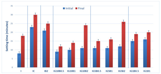 As can be seen in Figure 2, the decrease of sodium bicarbonate (B) dosage from 2% up to 0.5% in the compositions with FGD gypsum (1%, 5% and 10%), decreases the setting times. The increase of FGD gypsum dosage from 5% up to 10% decreased the setting times.
