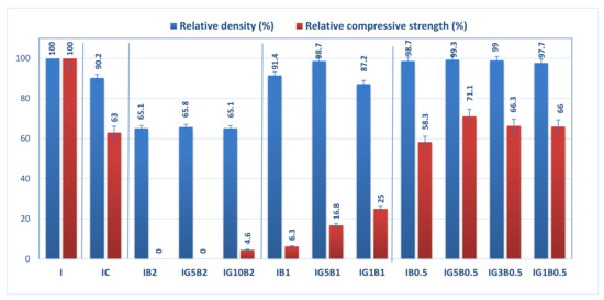 The relative geometrical density and relative compressive strength (calculated with reference to the values obtained for I specimen) for the gypsum binder with 0.3% HMEC and various amounts of sodium bicarbonate and FGD gypsum are presented in Figure 3.