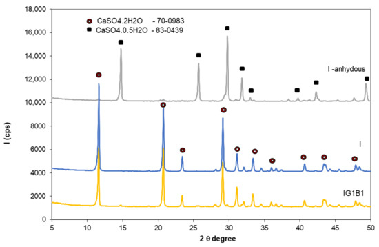 XRD patterns of gypsum binder I—anhydrous and I and IG1B1 hardened pastes.