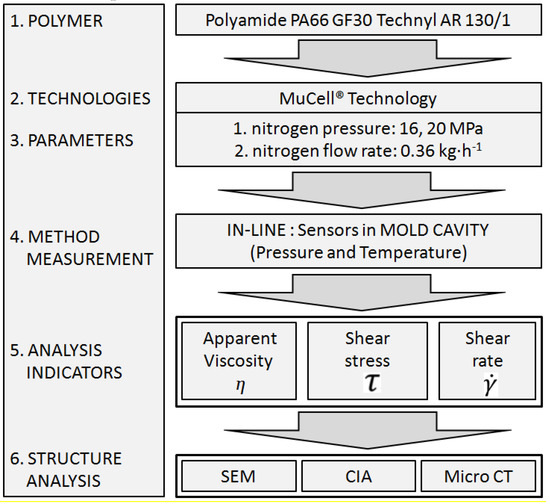 The aim of the study was to determine the influence of MIM technology on rheological properties of the PA66 GF30 melt determined by pressure and temperature sensors located in the mold cavity. In the study, a system to monitor pressure and temperature in a mold cavity during the filling and cooling phases of the injection molding process was applied. The relationship between nitrogen pressure, melt viscosity, and the microcellular structure obtained in the MIM process was investigated. The aim was to obtain an expected microcellular structure for thick-walled molded parts filled with a large amount of short fibers.