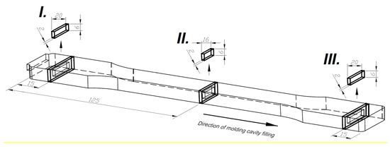 The influence of the MIM process parameters on the microcellular structure of PA66 GF30 parts based on SEM and micro CT images was evaluated. The samples for structural tests were taken from the sections of the foam parts, as shown in Figure 2. According to our research program, samples were taken from the following areas: Close by the gate (I), midpoint of the measurement area (II), and the end of the polymer flow path (III). The selection of the sampling place takes into account the change in the cross-section of the mold cavity.