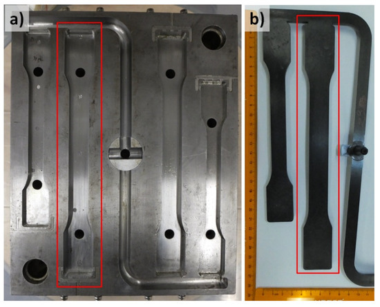 In the presented study, a four-cavity injection mold was used to produce thick-walled molded pieces (Figure 3a). The MIM process was monitored in the mold cavity marked with a red frame in Figure 3a. The molded parts reveal twice the dimensions compared to the specimens according to PN-EN ISO 527-2 type 1B (Figure 3b).
