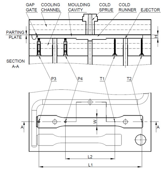 The mold body was made of 1.1730 steel with a hardness of 190 HB. The forming plates were made of 1.2312 steel with a hardness of 30 ± 2 HRC and had dimensions of 290 mm × 235 mm. The runner was 183 mm long and had a section in the shape of a parabola with a width of 11 mm. Gap gates of 24 mm wide and 4.2 mm deep were applied in the cavity. Cooling channels were made in both molding plates symmetrically, relatively to the mold parting plane. The cooling channels were made parallel to flow direction of the melt in the mold cavities. Two pressure sensors type 6002B (sensitive 4.93 pC/bar) and two temperature sensors type 4008B (thermocouple type N) were used. These elements of the measuring system were assembled in the bigger mold cavity (Figure 4). Two temperature and two pressure sensors applied inside the mold cavity were marked as T1, T2 and P3, P4, respectively (Figure 4). Temperature sensors were mainly used for the detection of a flow position. The pressure sensor P3 was located directly behind the gates. The temperature sensor T2 was located at the end of the melt flow path. The distance between these sensors was L1 = 245 mm (Figure 4). A second pair of sensors (P4 and T1) was located in the measuring section of the specimen (the smallest width 20 mm) in a distance of L2 = 118 mm. Locating the second pair of sensors in the mold cavity guarantees a stable flow of the polymer melt through the constant cross-section. Other dimensions of the mold cavity are marked as follows: W = 20 mm (width of the mold cavity in the P4 and T1 sensors assembly), H = 8.4 mm (depth of the mold cavity with assembled sensors). Measurements were recorded during the filling and cooling phases. The voltage signals were recorded and processed by the eDAQTM 8102 (Priamus, Switzerland) transducer (converter).