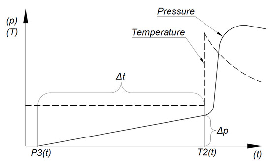 The principle of the apparent viscosity determination in the injection mold by the measurement of pressure and temperature in the mold cavity is presented in Figure 5. Data are recorded using pressure and temperature sensors placed on the measuring length Li. The measurement system begins to register the pressure and temperature each time the control system of the injection machine emits a signal corresponding to the closing stage of the mold. A proper measurement of Δp corresponds to changes of pressure between the first pressure increase and the moment of receiving a signal from the temperature sensor (ΔT). The measured values of ΔT and Δp are subsequently used to determine the values of shear rate (), shear stress (τ), and apparent viscosity (η).