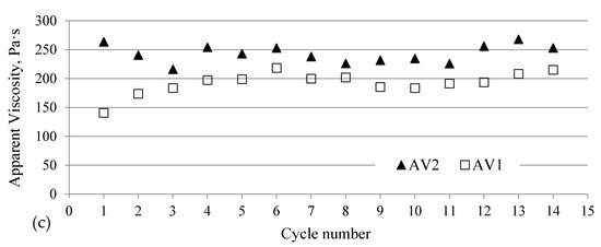 Apparent viscosity changes measured in the injection mold cavity: (a) For the PA66 GF30 melt—sample A, (b) for the PA66 GF30 melt with nitrogen—sample B, (c) for the PA66 GF30 melt with nitrogen—sample C.